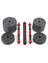 4 диска по 1,25 кг + 4 диска по 1,5 кг, 4 диска по 2 кг + 2 пластиковых полнотелых грифа 40 см по 275 грамм, коннектор 40 см 300 грамм, 4 пластиковых замка по 10 г |